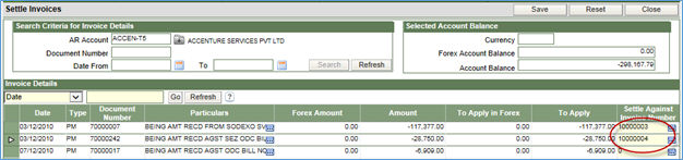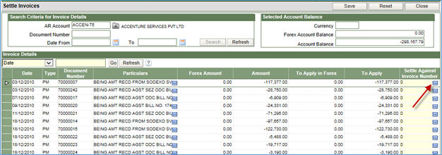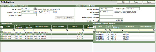 7. Click OK on top of the screen to move back to the main screen in which the selected invoice number will be displayed in the column - Settle Against Invoice Number.