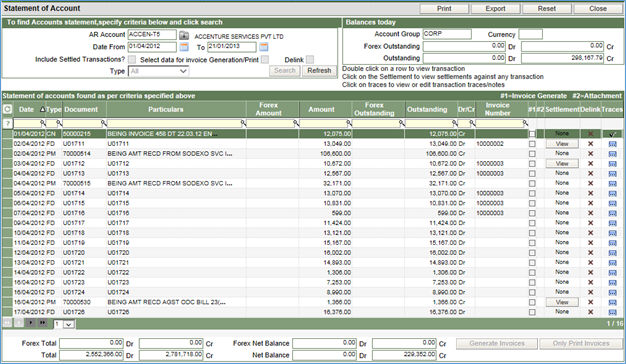 The statement of account displays the exact status of a debtor at any given point of time. This can be viewed by selecting the option of Statement of Account from the main menu. The same can also be printed as a report from the Reports of Accounts Receivable screen.