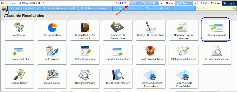 To record the receipt of the payment in the central unit, use the option - Central Payment, in the main menu of the Accounts Receivable module.