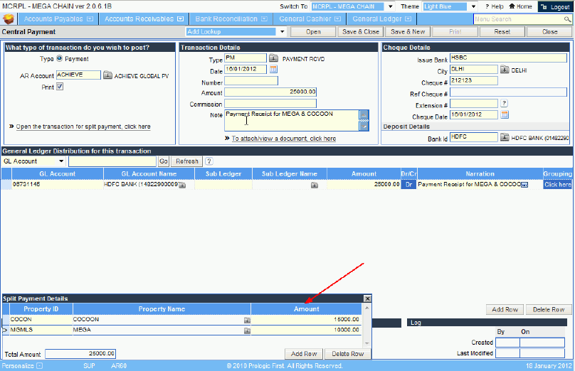 The screen is almost like the one where Payment transactions are recorded by individual units. The only difference is the section, at the bottom left, in which enter the individual unit ids to which the total receipt amount is to be distributed.